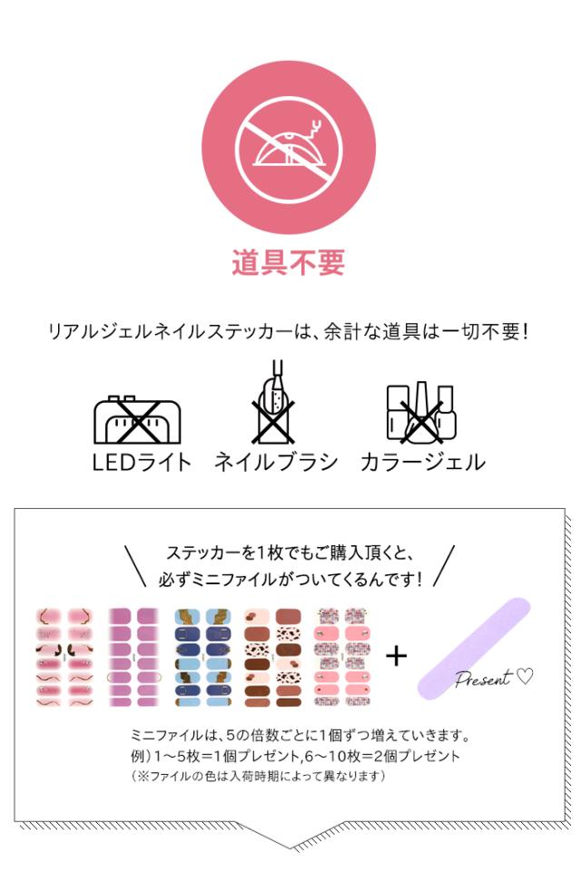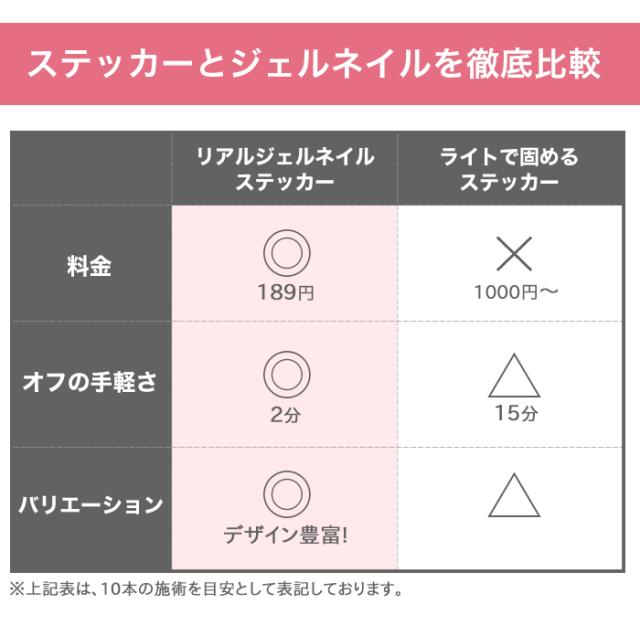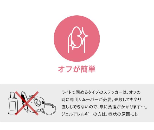 | 商品説明 | まるで本物のジェルネイル?! 貼るだけ簡単着せ替えネイル♪リアルジェルネイルステッカー 豊富なデザインバリエーションの中から気分に合わせてネイルチェンジ とにかく時短!忙しいママや週末ネイルにもピッタリ お仕事上ネイルができない方でも、週末だけのネイルが楽しめます♪ 貼るだけで完結するシンプルな工程で時間をかけずにサクッとネイルチェンジでき オフする際はぺりっと剥がすだけ♪ シールなら貼り替えるだけなので自爪への負担もほどんどありません! |