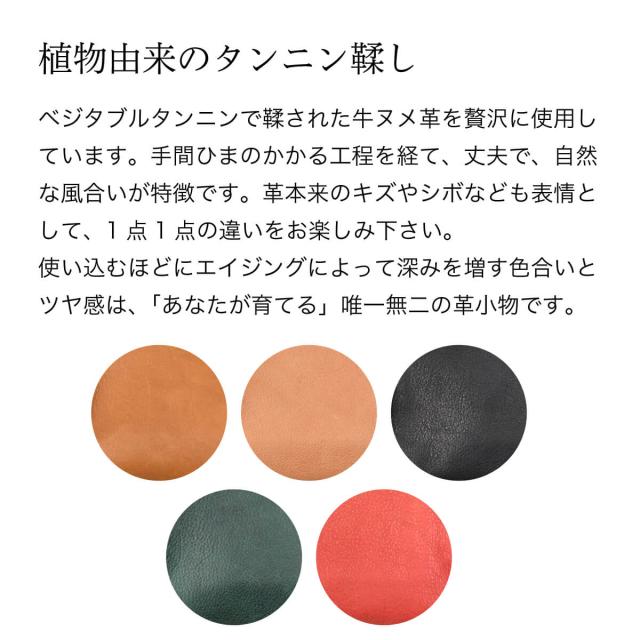 ベジタブルタンニンで鞣された牛ヌメ革を贅沢に使用しています。手間ひまのかかる工程を経て、丈夫で、自然な風合いが特徴です。革本来のキズやシボなども表情として、1点1点の違いをお楽しみください。