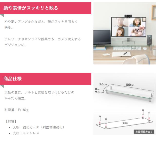 - 幅100センチの机に100センチのモニター台は不安でしたが。金属製の脚の取り付け位置が内側に約2.5cmズレているので無事安定着地^_^ 高さも微調整が効くのでノーマルより若干高めで、100均で買った...
