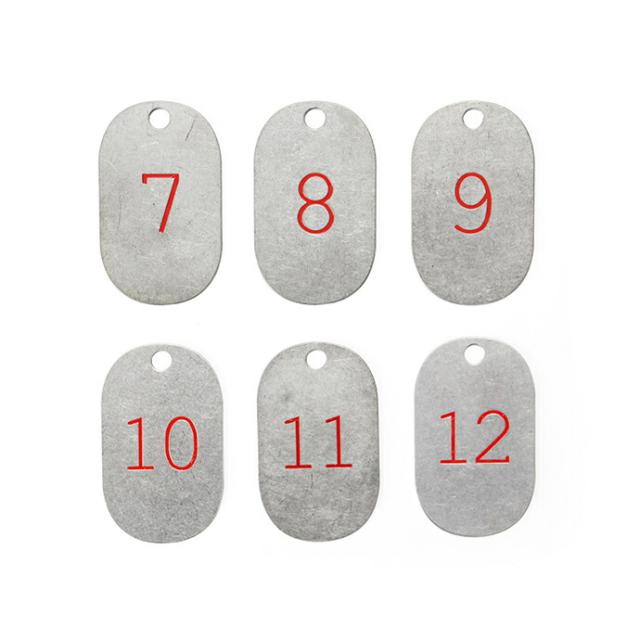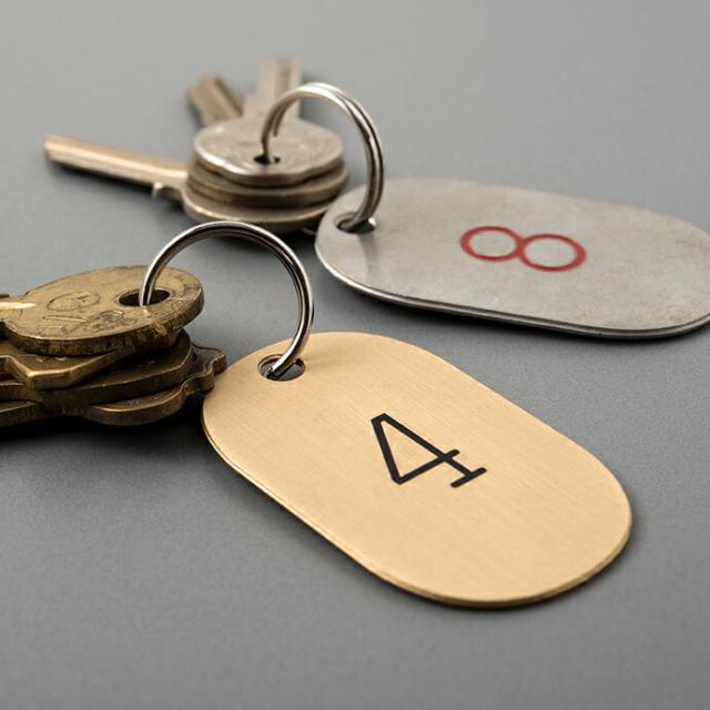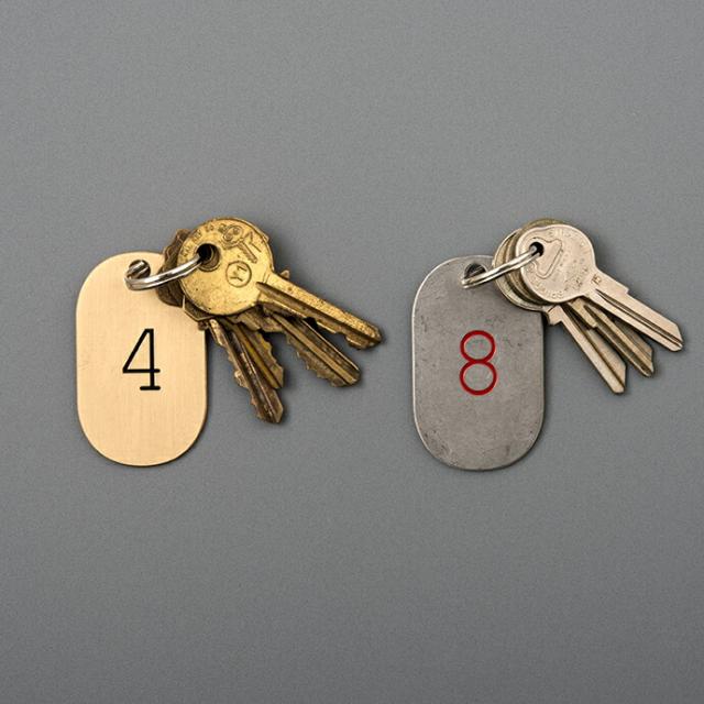 1から12までの番号が刻印された、真鍮製のキータグ。