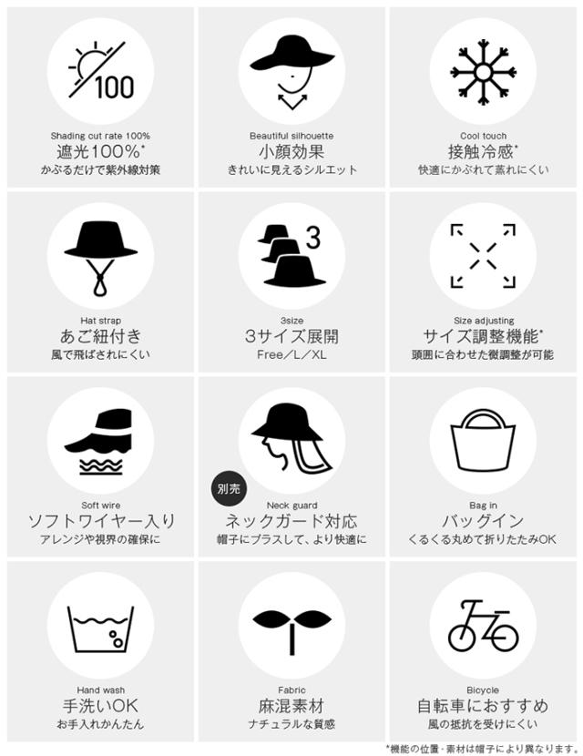 | ・高さはモデル着用時の高さを記載しています。 ・頭囲・高さ・つばのサイズ表記は、5ミリ前後の誤差が生じる場合があります。計測サイズは目安としてお考えください。 ・遮光生地の厚さには多少の差異があり、中にはシャカシャカと音がする場合があります。 ・お取り扱いの前に品質ネームタグの記載をご確認ください。 ・ご覧頂くモニターの発色具合によって実物と色が異なって見える場合があります。 ・単品商品の撮影画像が実際の商品と色合いが近くなっていますので、ご参照ください。 ・同商品でも、染色過程で色味が多少変わる場合があります。 ・マジックテープでのサイズ調整可能 ・つば先ワイヤー入り ・取り外し可能なあご紐付き |