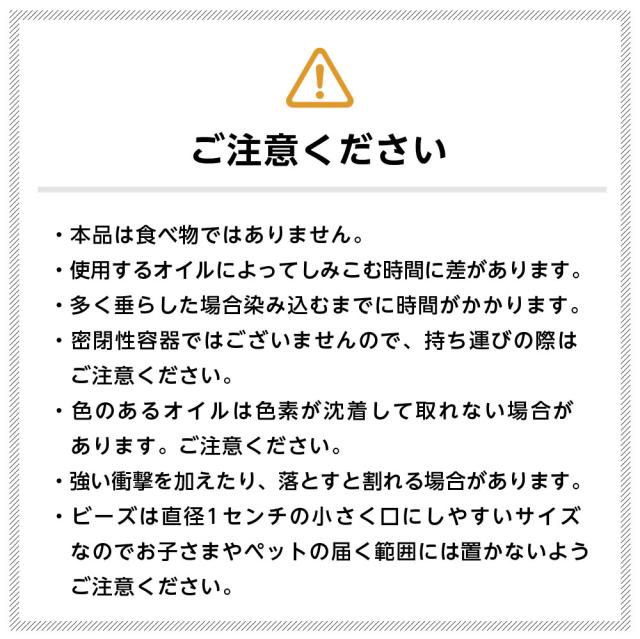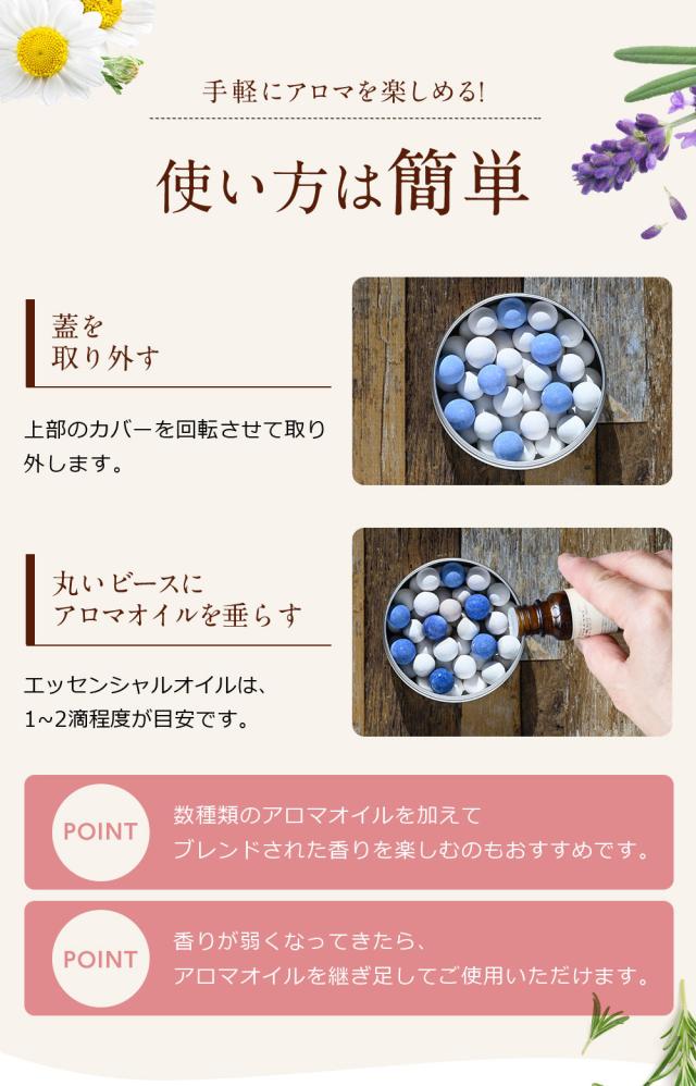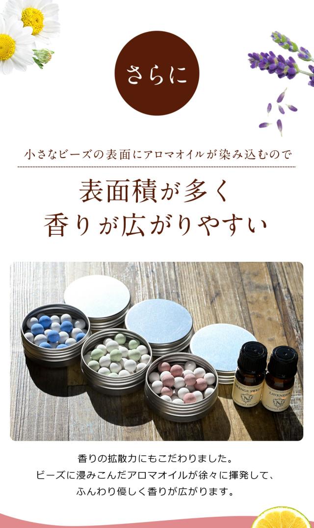 【特徴】小さなビーズの表面にアロマオイルが染み込むので、香りが広がりやすい特徴があります。また缶に入っていますので精油を家具や床にこぼしません。
