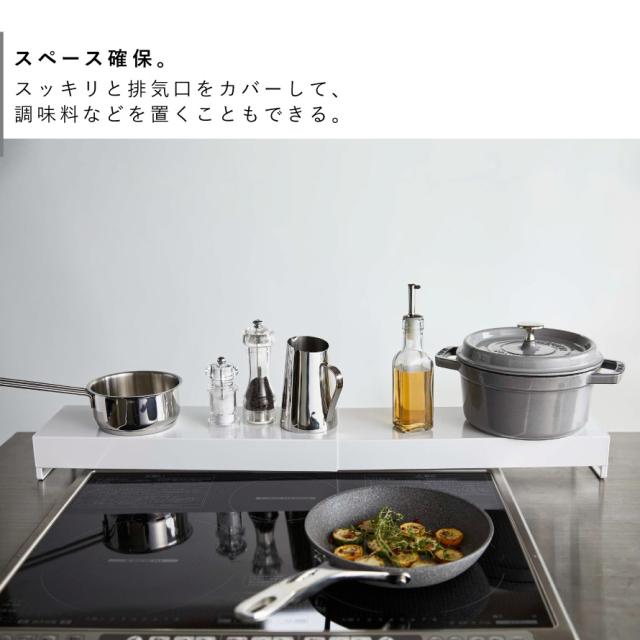 スパイスや調味料はもちろん、鍋やフライパンが一時置きできる伸縮排気口カバー。排気口に置くだけの簡単設置。