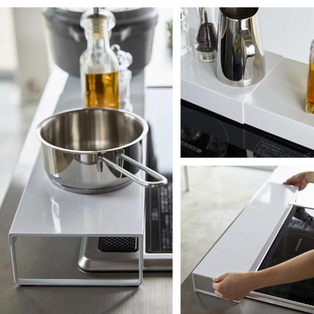 IHクッキングヒーターや、ビルトインガスコンロの排気口に飛び散る油はね・調理くずなどの汚れを防止します。グリル使用時に動かしたい時は、排気口部分にかからないよう奥にずらすだけ。