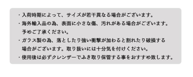 | 注意事項 | ・入荷時期によって、サイズが若干異なる場合がございます。 ・海外輸入品の為、表面に小さな傷、汚れがある場合がございます。 予めご了承ください。 ・ガラス製の為、落としたり強い衝撃が加わると割れたり破損する場合がございます。 取り扱いには十分お気お付けください。 ・使用後は必ずクレンザーでふき取り保管する事をおすすめ致します。 |