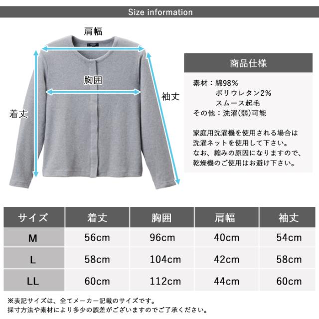 スナップボタンで着脱がらくらく。 すっきり着られるカーディガン。 肌に優しい綿素材で、洗濯(弱)も可能でいつでも衛生的。 職場や学校、普段使いなど毎日活躍するカーディガンです。 ■サイズ:M〜LL ※サイズにつきましてはメーカー表記サイズとなります。 詳細は商品画像をご確認下さい。 ■素材:綿98% ポリウレタン2% スムース起毛 ■その他:洗濯(弱)可能 <注意事項> ※家庭用洗濯機を使用される場合は洗濯ネットを使用して下さい。 なお、縮みの原因になりますので、乾燥機のご使用はお避け下さい。 ※お客様のご覧になられますパソコン機器及びモニタなどの違いにより、実際の商品素材の色と相違する場合もありますのでご了承下さい。 ※モデル着用写真は屋内外での撮影の為、光の影響等で実際のカラーとは異なる場合がございます。【2102】 |