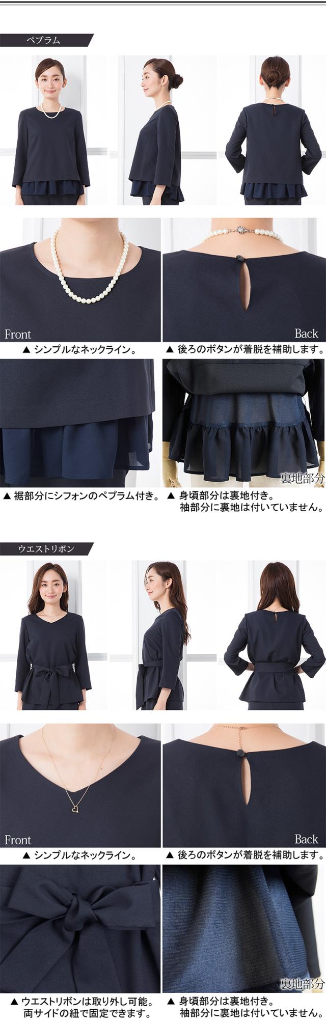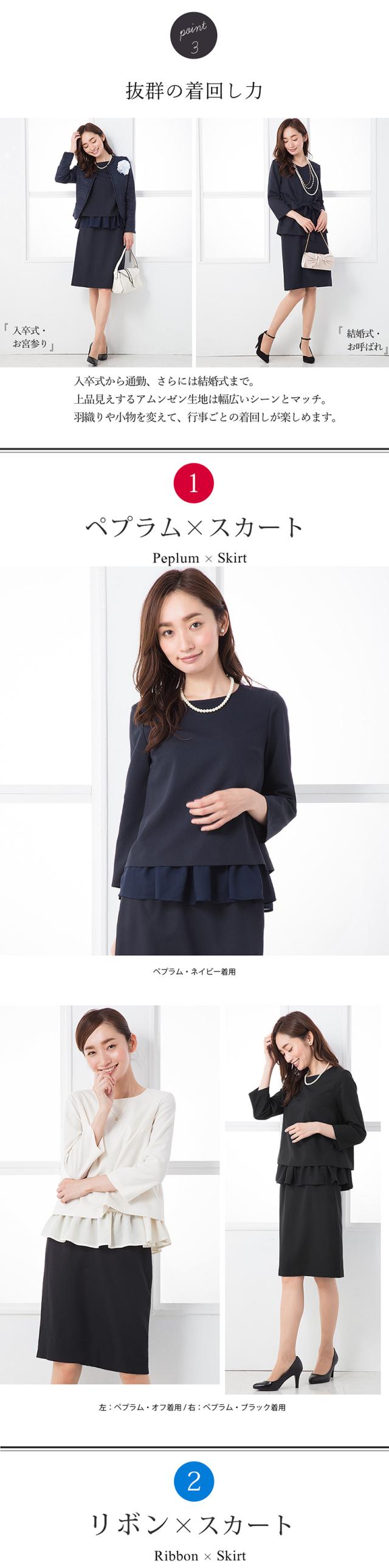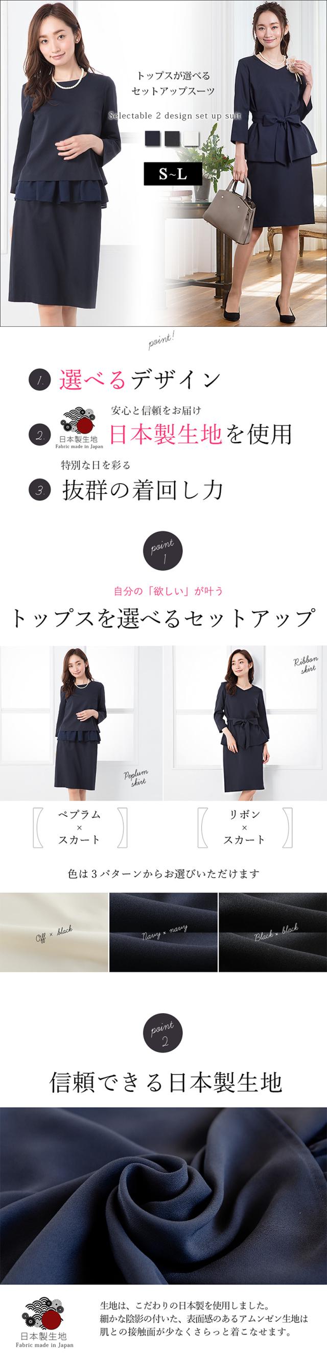 | トップスが選べるセットアップスーツ。 入学式・卒業式・七五三・お宮参り等のフォーマルシーンや、結婚式・ちょっとしたお呼ばれなど、パーティーシーン、通勤などのビジネス・オフィススタイルとしてもおすすめです。 トップスは、ペプラムとウエストリボンから選べます。 フォーマルスーツほど堅苦しくなく、どんなシーンでも着やすい、一着あると便利なセットアップです。 シンプルなデザインなので、程良くトレンドを取り入れたい方にもおすすめ。 | |