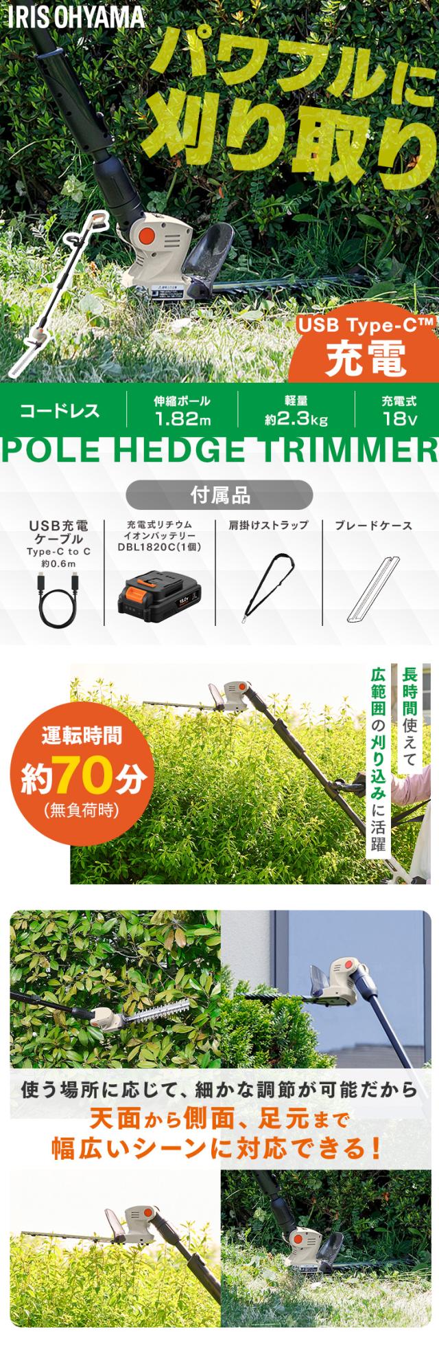 【Type-C充電&バッテリー共用できる】ポールヘッジトリマー 充電式 18V 剪定バリカン 高枝切りバサミ 電動 軽量 最大1.8m 高所 生垣 高枝 庭木 植木剪定 コンパクト 肩掛けストラップ JPHT254TC アイリスオーヤマ *
