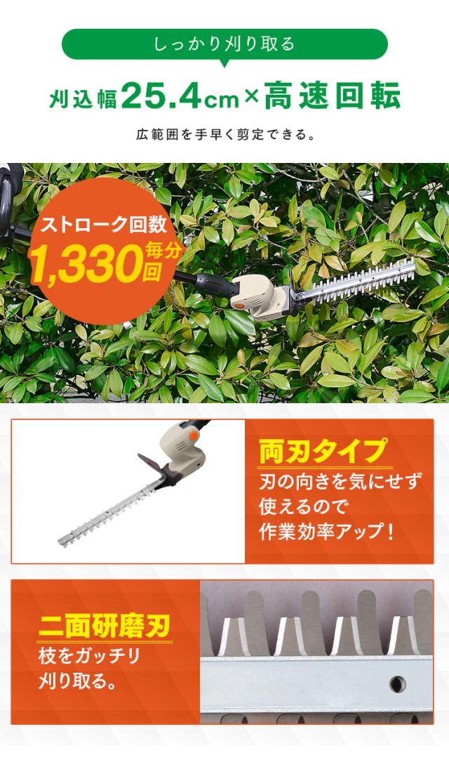 “刈込幅:約25.4cm×高速回転(ストローク回数毎分1330回)”で、広範囲を手早く剪定できます。
