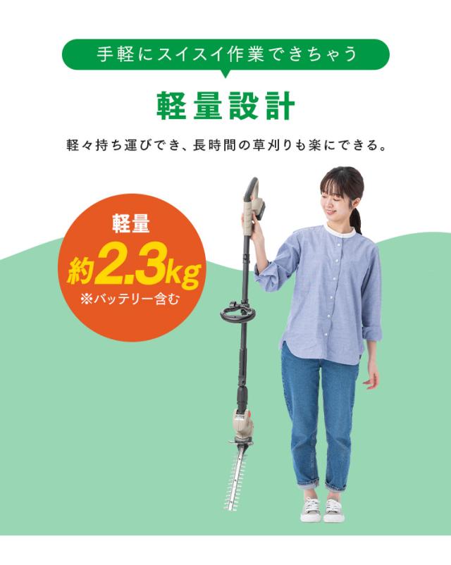 高所の剪定から草刈りまで使えて、長時間(※)・広範囲の刈り込みにおすすめなポールヘッジトリマーです。