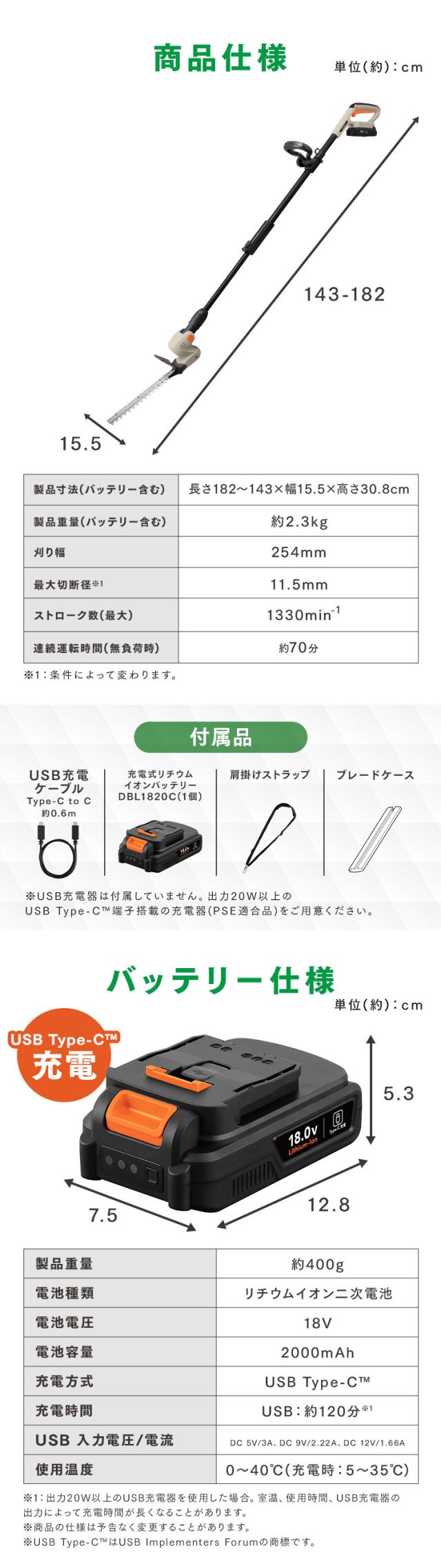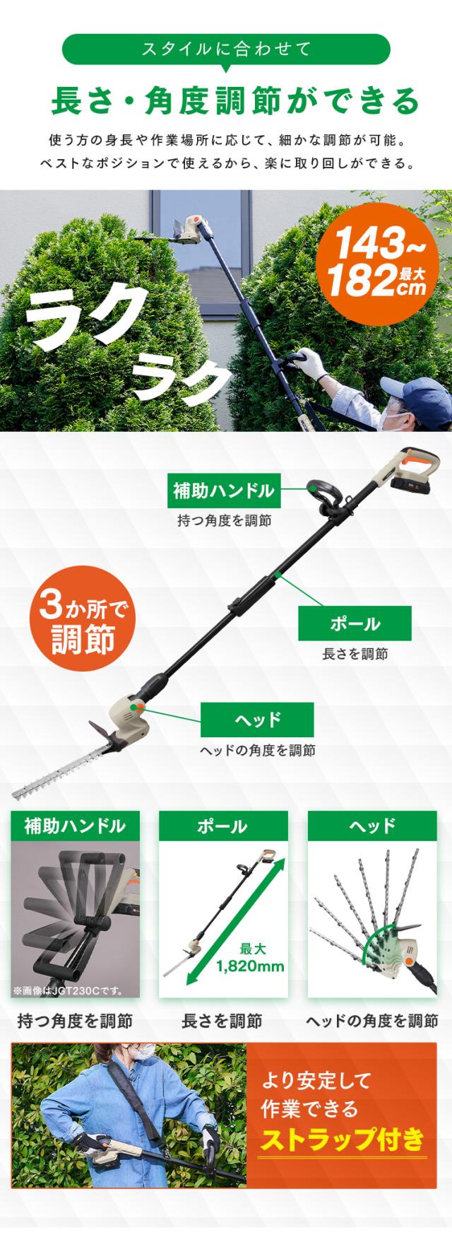 [検索用:Type-C充電&バッテリー共用できる ポールヘッジトリマー 充電式 18V 電動 軽量 最大1.8m 高所 生垣 高枝 庭木 植木剪定 コンパクト 肩掛けストラップ 4967576744102]