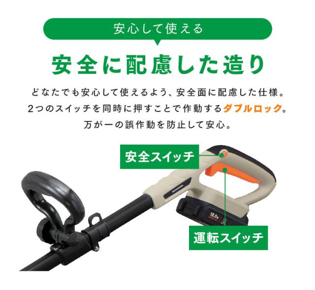 安全スイッチと運転スイッチを同時に押すことで作動する「ダブルロック」で、万が一の誤作動を防止します。