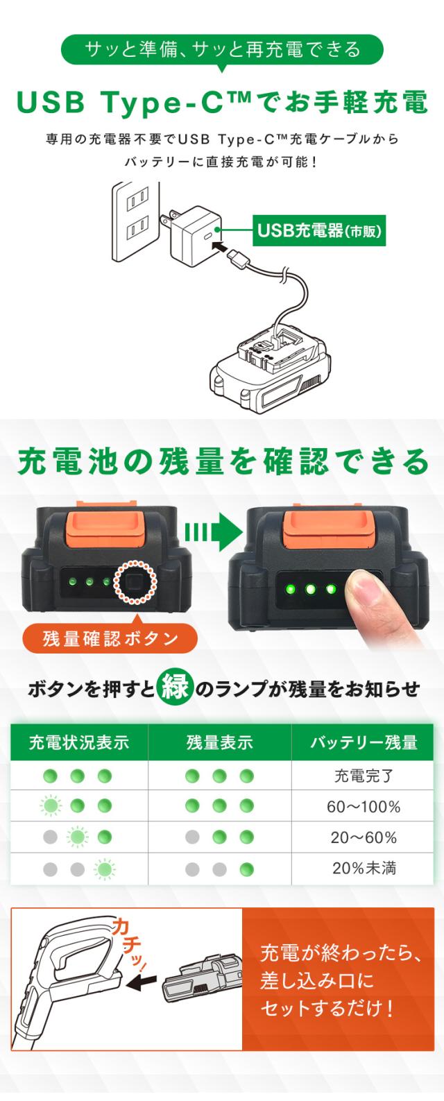 ※USB充電器は付属していません。出力20W以上のUSB Type-C(TM)端子搭載の充電器(PSE適合品)をご用意ください。