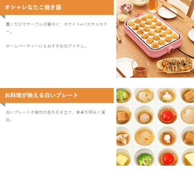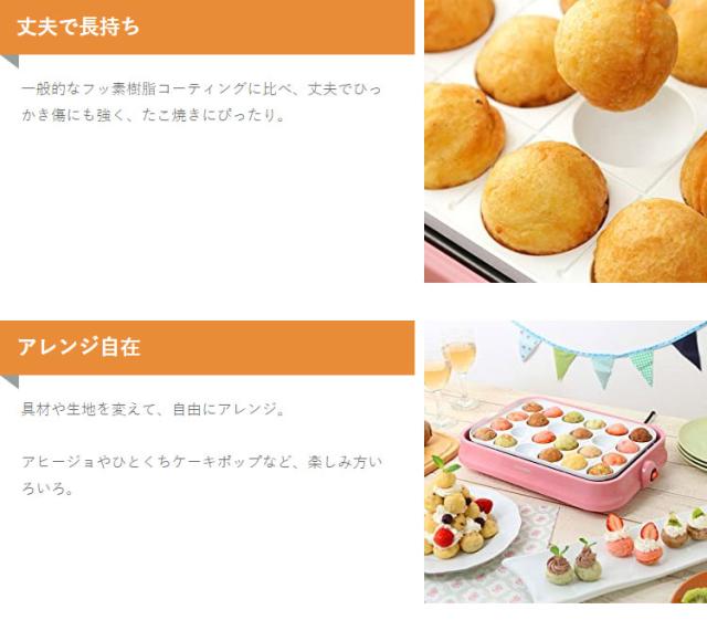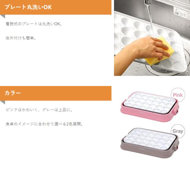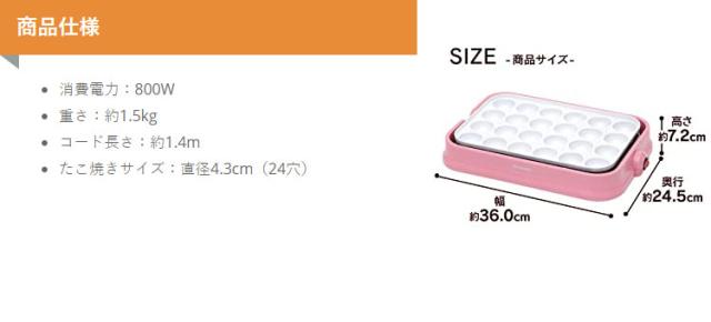 ■商品サイズ(cm)幅約36×奥行約24.5×高さ約7.2■たこ焼き穴直径4.3(穴:24個)■重量約1.5kg■電源AC100V (50/60Hz共用)■定格消費電力800W■電源コード長さ約1.4m■プレートヒーター分離式■定格電圧AC100V■定格周波数50Hz/60Hz■定格消費電力800W■温度ヒューズ216度■容量9.5L■セット内容本体、たこ焼きプレート※当商品はお取り寄せ品の為、在庫の確認及び商品のお届けまでお時間を頂く場合がございます。また、商品がメーカーにて完売となっていた場合、キャンセル又は注文内容の変更をお願いいたしております。予めご了承くださいますようお願いいたします。