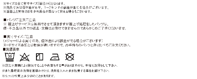 (ヌードサイズ表記とは数値が違いますので、お手持ちのパンツと測り比べてご注文ください。)