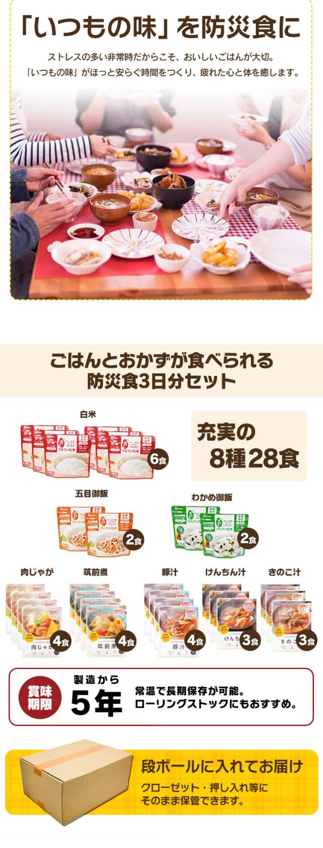 (アルファ化米飯(白米)100g×6食、アルファ化米飯(五目御飯)100g×2食、アルファ化米飯(わかめ御飯)100g×2食、和風汁物(けんちん汁)250g×3食、和風汁物(豚汁)250g×4食、和風惣菜(筑前煮)200g×4食、和風惣菜(肉じゃが)220g×4食、和風汁物(きのこ汁)250g×3食)