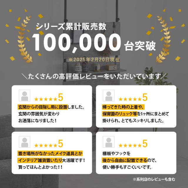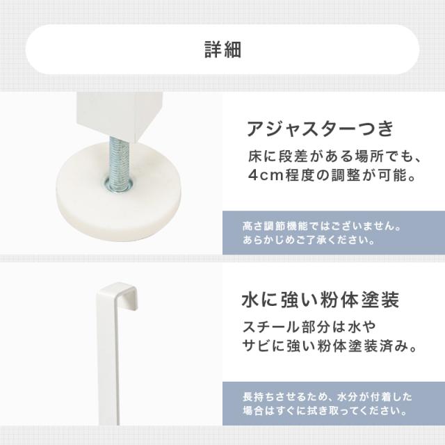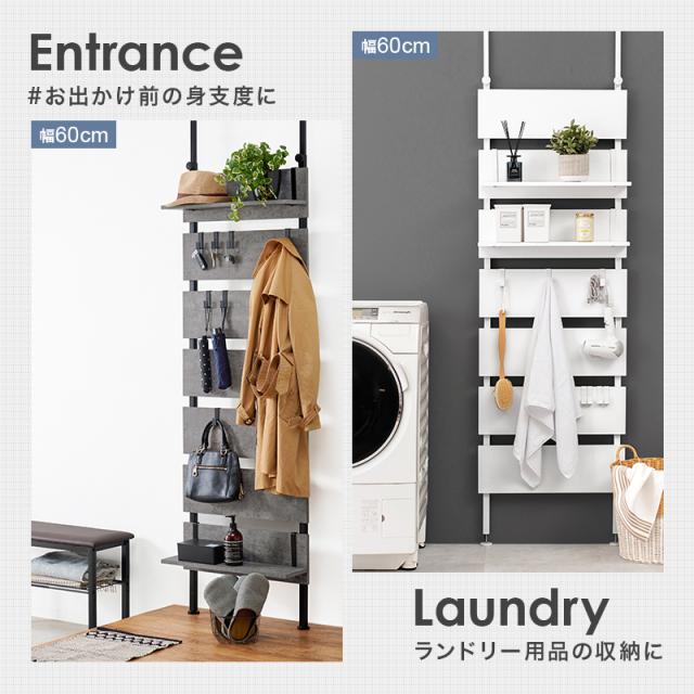 リビングやダイニング、玄関やキッチン、クローク、WIC、脱衣所やランドリールーム、洗面所、トイレなど、お部屋のいろいろな場所に設置できる突っ張り式ラック。