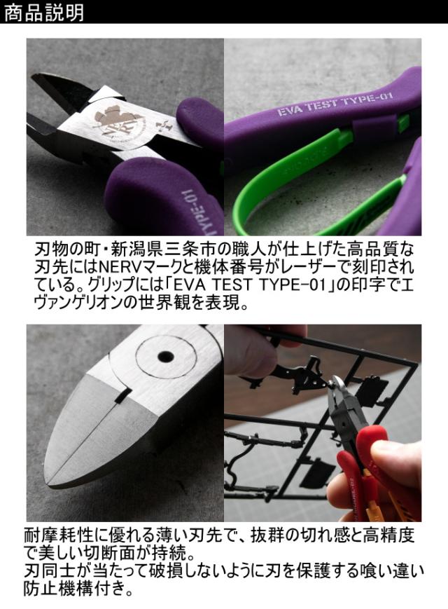 | 特徴 | エヴァンゲリオンをモチーフにしたスタイリッシュなニッパ。 プラスチックの切断に特化した専用ツール。 刃物の町・新潟県三条市の職人が仕上げた高品質な刃先にはNERVマークと機体番号がレーザーで刻印されている。 耐摩耗性に優れる薄い刃先で、抜群の切れ感と高精度で美しい切断面が持続。 刃同士が当たって破損しないように刃を保護する喰い違い防止機構付き。 耐久性に優れ、やわらかな使用感のプラスチックバネを採用。 エラストマー樹脂をグリップに採用し、手になじむ使用感。 初号機モデル、2号機モデル、零号機モデルの3種類からお選びください。 ※WEB画像と実物では色合い等異なる場合がございますがご了承ください。 |
