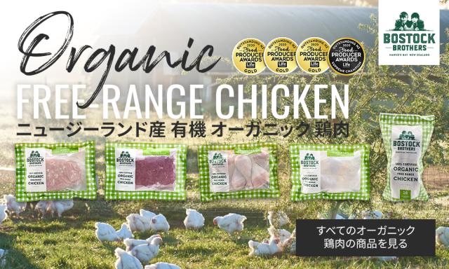 ニュージーランドにて完全放牧のフリーレンジ(鶏をケージに入れず、自由に歩き回れる環境で飼育する方法)で育てられ、オーガニック認証を取得した鶏肉です。鶏たちは、ニュージーランドのホークスベイ地方にあるオーガニックリンゴ畑の中で、自由に歩きまわり好きな時に食事をとれるという環境下で、ゆっくりと愛情を込めて育てられています。抗生物質、成長促進ホルモン剤、遺伝子組換え飼料、化学物質、塩素、ワクチン、薬剤などは一切不使用です。飼料や農地にも合成化学物質は一切使用していません。オーガニック認証というのはご自身の身体だけでなく、自然環境にとっても好ましいありかたです。ボストックブラザーズ農場は、ニュージーランドで唯一オーガニック認定されたチキンの農場です。