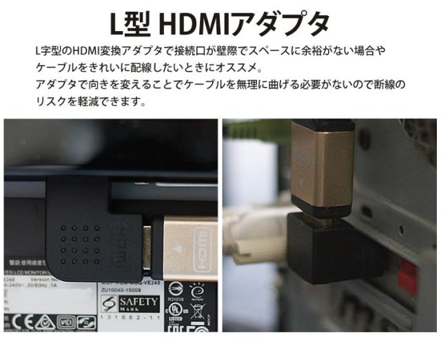L字型のHDMI変換アダプタで接続口が壁際でスペースに余裕がない場合やケーブルをきれいに配線したいときにオススメ。
