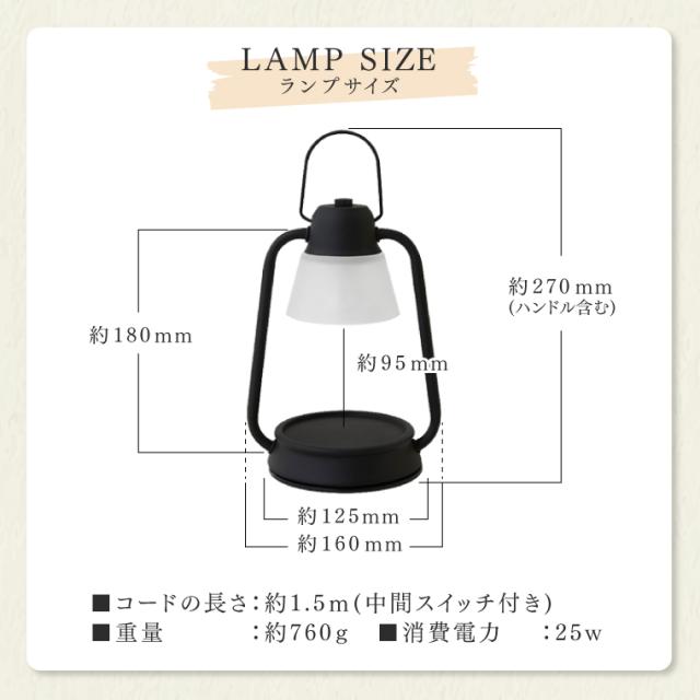 | サイズ | 【キャンドルウォーマーランプミニ】 本体サイズ:W160×L125×H270mm(ハンドル含む) コードの長さ:約1.5m 中間スイッチ付き 重量:約760g ◆キャンドルを置く台の内寸:約9.5cm ◆ライトからキャンドル台までの高さ:約9.5cm 【香るキャンドル】 本体サイズ:約φ51×H62mm 重量:約140g |