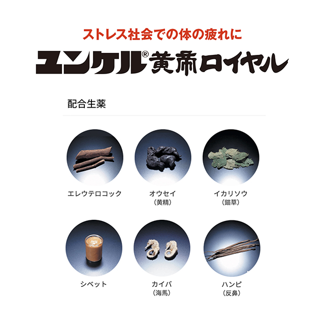 黄精をユンケルDの2倍量配合し、イカリソウ、シベット、海馬、ハンピの他、ビタミンE、B2、γ-オリザノールを配合。