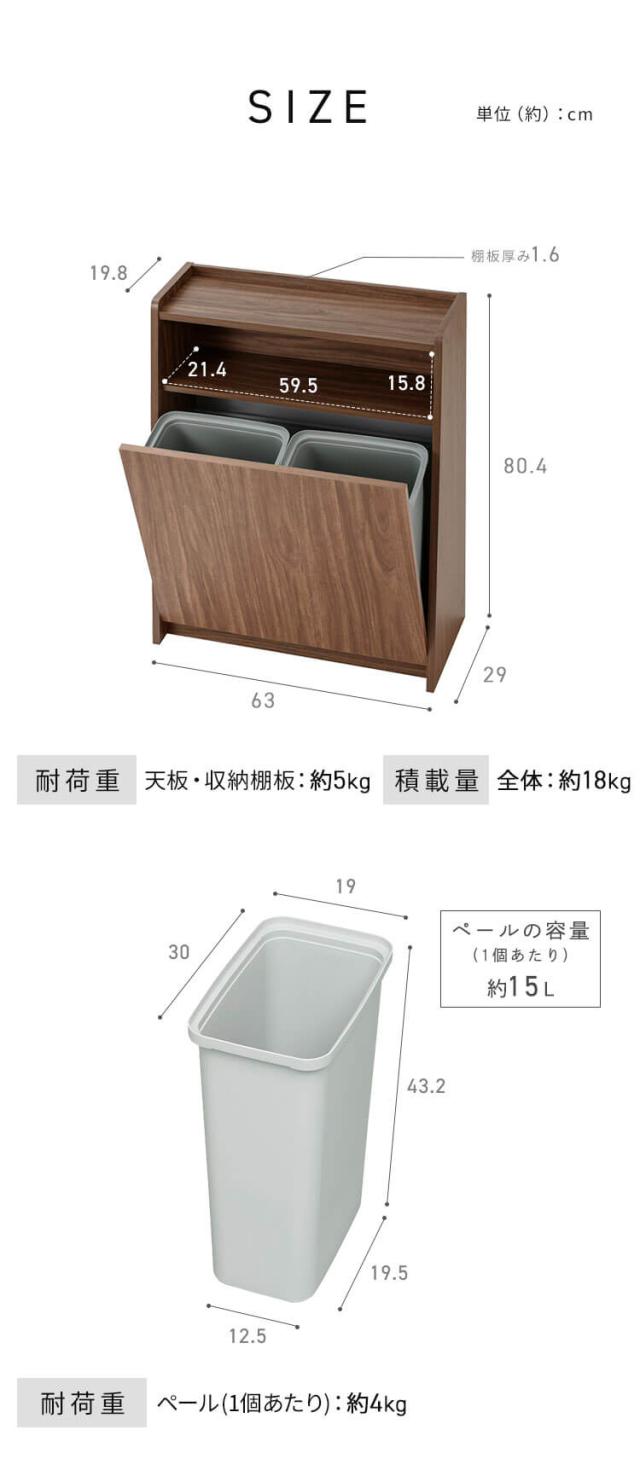 ペール収納が2口あるので、「可燃ごみ・不可燃ごみ」など2種類の分別が可能。