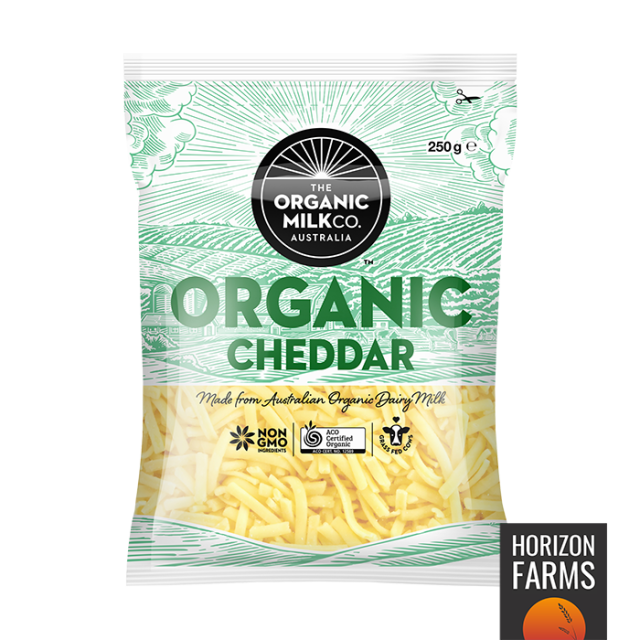 世界中の高品質の食品を選りすぐりお届けしているHORIZON FARMSが最高品質のチェダーチーズをご用意しました。グラスフェッドで育った牧草牛(グラスフェッド牛)の生乳より作られ、オーガニック認証を受けた高品質の英国式チェダーチーズです。最大12ヶ月間熟成させ、お使いいただきやすいようにシュレッド状にしました。牛たちは広大な牧草地で伸び伸びと自由に草を食べて育ち、成長促進ホルモン剤や抗生物質は投与されておりません。もちろん餌となる牧草も化学物質や殺虫剤とは無縁かつ、遺伝子組み換えではないものになります。セルロース不使用、保存料不使用、甘味料不使用、着色料不使用、香料不使用で、食品添加物は一切不使用のチーズです。動物性レンネット(凝乳酵素)も使用しておりませんので、ベジタリアンの方でも安心してお召し上がりいただけます。これほどクリーンなチーズはなかなか無いのではないでしょうか。1袋に250gのシュレッド状のチェダーチーズが入っています。有機タピオカ澱粉を加えることにより、チーズとチーズがくっつくのを防ぎ、必要な分だけ冷凍庫から取り出してお使いいただけるのでとても便利です。お菓子作りやお料理にはもちろん、おつまみとしてもお楽しみいただけます。ハンバーガーのトッピングとしてや、パスタに絡めてお召し上がりいただく方法がおすすめです。