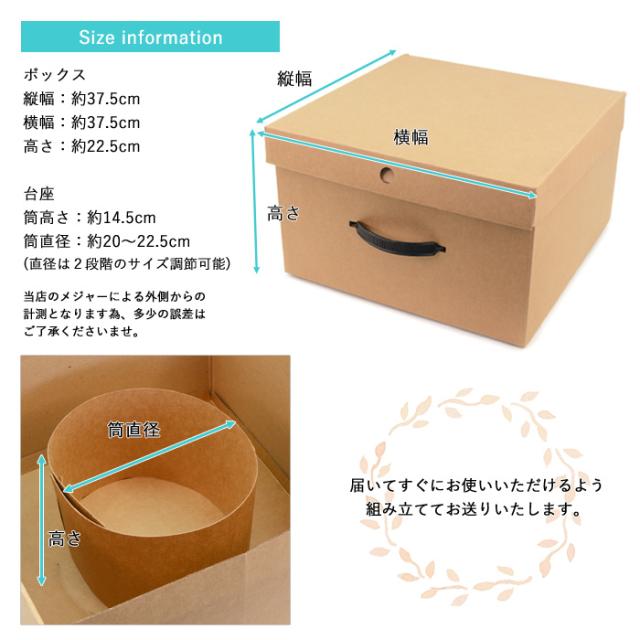 贈り物や保管ケースとして使える、帽子専用のギフトボックス。 丈夫な厚紙素材でできており、取っ手付きでらくらく収納。 内側にはサイズ調節可能な台座もあり、帽子の型崩れを防ぎます。 届いてすぐにお使いいただけるよう、組み立ててお送りいたします。 ■サイズ: ボックス本体 縦幅:約37.5cm 横幅:約37.5cm 高さ:約22.5cm 内側台座 高さ:約14.5cm 直径:約20〜22.5cm (2段階のサイズ調節可能) ※当店のメジャーによる外側からの計測となります為、多少の誤差はご了承下さいませ。 <ご注意> ※お客様のご覧になられますパソコン機器及びモニタなどの違い、また室内、室外での撮影により実際の商品素材の色と相違する場合もありますのでご了承下さい。 なお著しい色の相違は御座いませんのでご安心ください。 【2104】 |