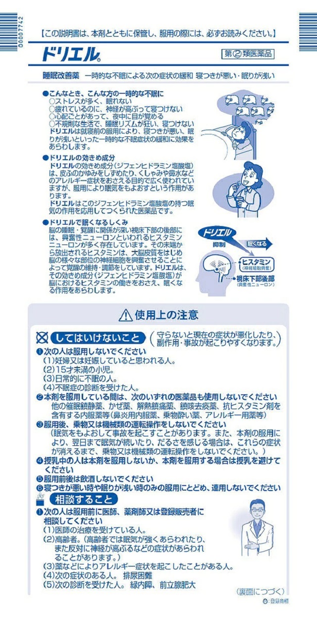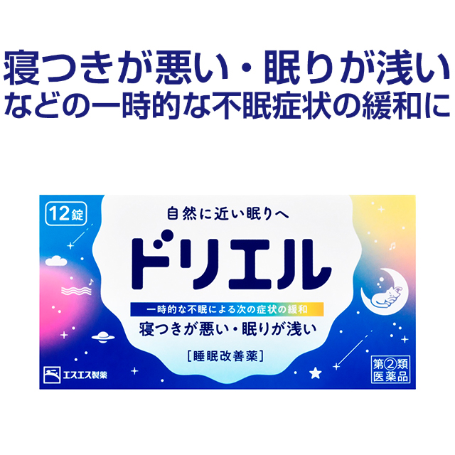 商品名 指定第2類医薬品 ドリエル12錠 エスエス製薬 容量 12錠 JANコード 4987300049419 メーカー エスエス製薬 カテゴリー 医療・介護・医薬品>医薬品>催眠鎮静剤>催眠鎮静剤【第一・二類医薬品(指定第二医薬品含む)】 効果・効能 一時的な不眠の次の症状の緩和:寝つきが悪い、眠りが浅い 用法・用量 寝つきが悪い時や眠りが浅い時、次の1回量を1日1回就寝前に水又はぬるま湯で服用してください。
