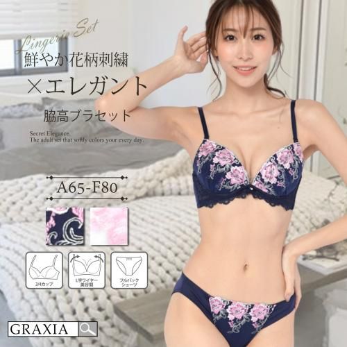 【グラシア】 ブラセット ブラショーツ ランジェリー 下着 ブラ セット ブラ&ショーツ カップ エレガント バストライン ビジュー ボーン 脇高 花柄 刺繍 鮮やか すっきり ネイビー ホワイト
