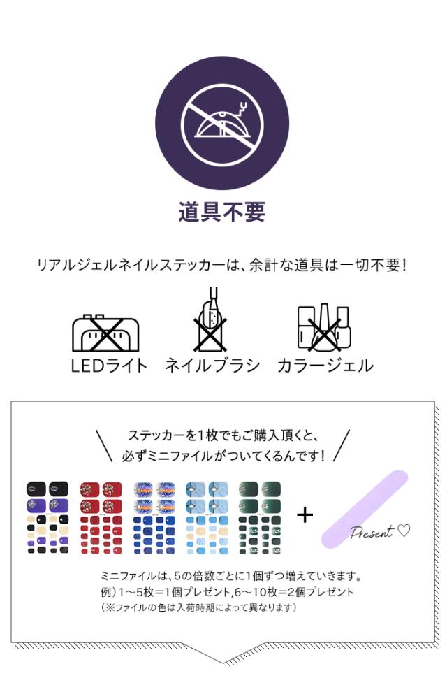 | 注意事項 | ・爪表面に油分が多いと貼りつきにくい場合がございます。表面の油分をクレンザー等で、除去しステッカーを貼り付けてください ・ファイルは消耗品のため、目が無くなったら新しいファイルでファイリングしてください ・破れやすい商品となりますので、扱う際はピンセット等で優しく扱って下さい。 ・入荷時期によって、色合いに若干の差異が生じる場合がございます。 ・ご覧になるモニターにより、カラーの見え方が異なる場合がございます。・パッケージのデザイン、ネイルファイルのカラーが異なる場合がございます。 ・パーツ等貼り付けている場合、オフする際、ゆっくりと剥がしてください。 ・乳白色や装飾の多いデザインは、それぞれシールの厚みが異なる場合がございます。 また入荷時期によって、製造工程が異なる場合があり 同じデザインでも色味や厚みが異なる可能性がございます。 予めご了承くださいませ。 |