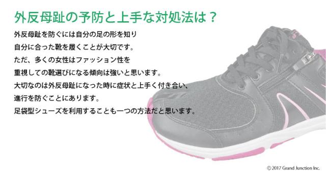 足指に隙間を作る構造により、本来の足の形に合わせた靴の着用ができるため、拇趾(親指)の外反が抑制される効果に期待できます。