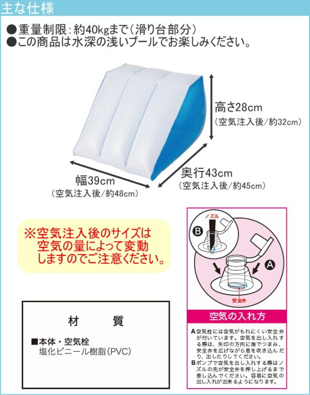 | 使用方法 | 1.水を入れる前の滑り台をプールの中に置きます。水を入れた後だと移動できなくなります。 2.広口バルブ部分から滑り台の中に水を入れます。使うプールの水位に応じて水量を調整してください。 3.空気栓から空気を入れてください。 ※電動ポンプを使用する際はポンプに水が入らないように注意してください。 4.プールに水を入れます。滑り台が動かないようにするため、プールの水位は滑り台内部の水位の半分程度にしてください。 |