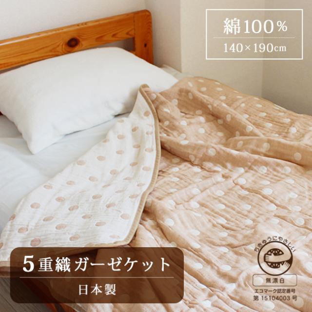 【送料無料】5重織ガーゼケット シングル(140×190cm) エコマーク 無漂白 無染色 水玉 ドット柄 ナチュラル 寝具 日本製 綿100% ベージュ ホワイト オリジナル商品 秋 冬 一年中 タオルケット