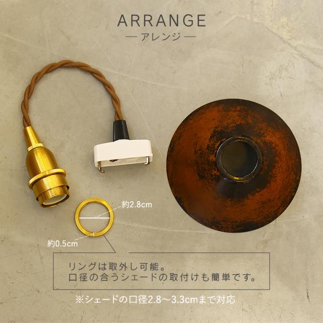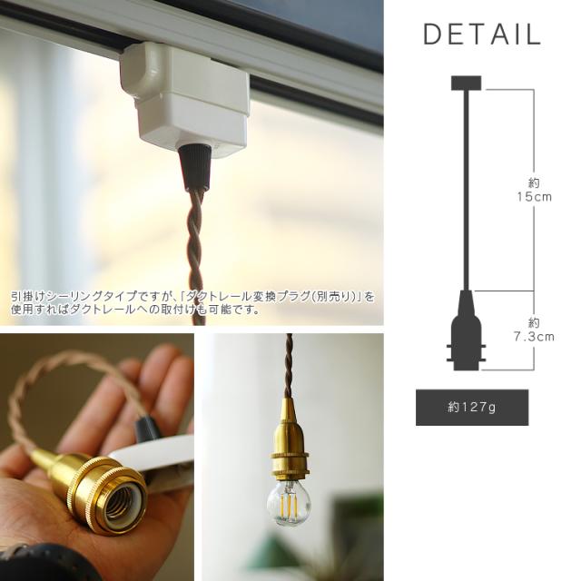 | 仕様 | 口金:E17用 プラグタイプ:引掛けシーリング用(ダクトレールに取り付ける場合はダクトレール変換プラグ(別売り)をご使用ください。 定格電圧:100V 対応電球:白熱電球60Wまで対応(LED対応) ※本製品はスイッチが付いておりません。必ず壁スイッチのあるお部屋でお使いください。 ※コードの延長、カットなどの加工は承っておりません。 ※PSEマークあり。 ※こちらの商品には電球が付いておりません。 ⇒エジソンバルブLEDのE17電球はこちら ※口径28mm-33mmのシェードを挟み込み可能。(軽量のものに限ります。) |