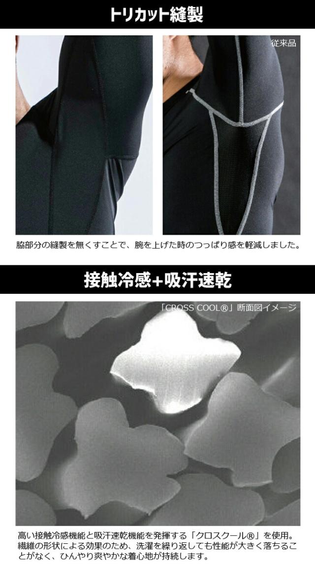 高い接触冷感機能と吸汗速乾機能を発揮する「クロスクール」を使用しており、繊維の形状による効果のため、洗濯を繰り返しても性能が大きく落ちることがなく、ひんやり爽やかな着心地が持続します。