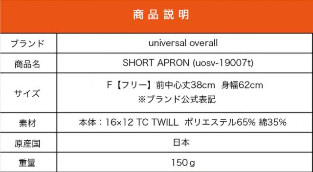 【即日発送】エプロン ショートエプロン ユニバーサルオーバーオール UOSV-19007T 男女兼用 メンズ レディース ガーデニング 飲食店 カフェ 花屋 キッチン【送料無料】