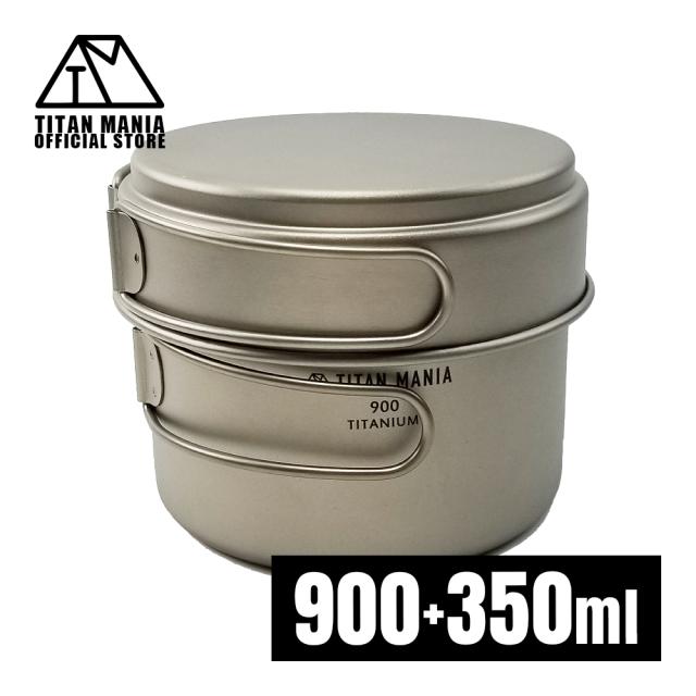 TITAN MANIA チタンマニア クッカー セット チタン製 900ml+350ml ソロキャンプ 深型 蓋付き 超軽量 頑丈 直火 コンパクト 二段式 折りたたみハンドル付 コッヘル 調理器具 バーベキュー アウトドア キャンプ用品 収納袋付き