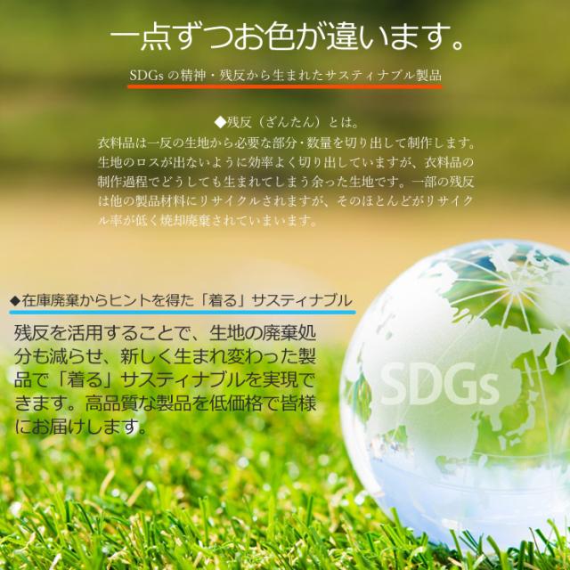 製造時に余った生地、残反(ざんたん)で仕立てたサスティナブルハーフパンツ!在庫廃棄からヒントを得た「着る」サスティナブル製品です。残反を活用することで、生地の廃棄処分も減らせ、新しく生まれ変わった製品で「着る」サスティナブルを実現できます。その為一点・一点・生地の風合いやお色に違いがあります。(同色のお色を複数ご購入いただいた場合は色・生地にバラツキがございます。)左右にはカーゴポケットが装備され収納力抜群です。