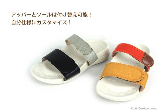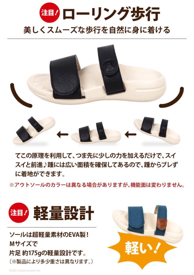 つま先とかかとの底が丸い形状でスイスイ前に進むローリング歩行を実現。 高低差がほとんどなく、快適に履けるソール形状です。 EVA素材を使用しているので驚くほど軽い!長時間の歩行でも疲れにくく歩くのが楽しくなります。 アッパーを取り外して丸洗いが可能!清潔に保てるのが嬉しい!