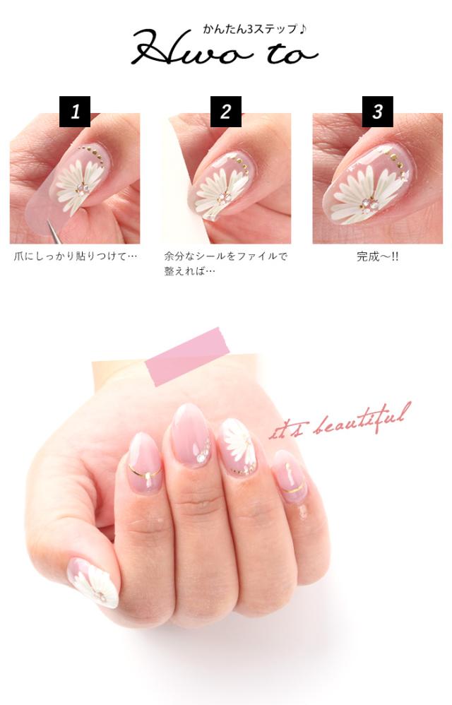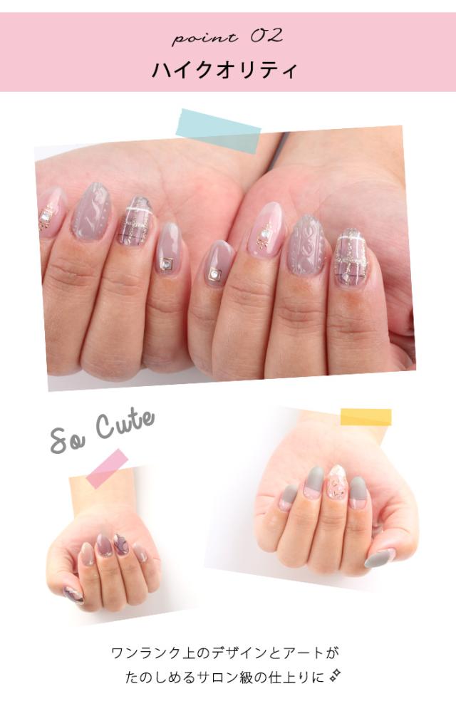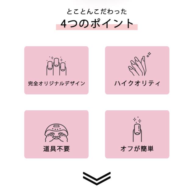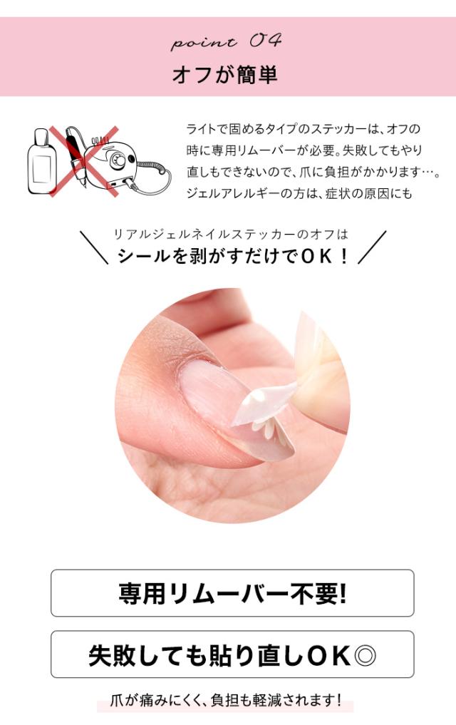| 使用方法 | 簡単3ステップで完成♪1.自爪の表面の汚れや油分をクレンザーやエタノールで拭き取ります 2.爪のサイズに合うシールを選び、爪の根元からシールを貼り付けます 3.余分なステッカーを付属のファイルで削り落とせば完成! 艶や強度を出すには… 仕上げにトップジェルを塗布し硬化することで、より艶や強度が増します! マットタイプのシールには、ノンワイプマットジェルで仕上げると、 マットな質感はそのままで強度が増します オフする際は… 爪の根元からゆっくりシールを剥がします! |