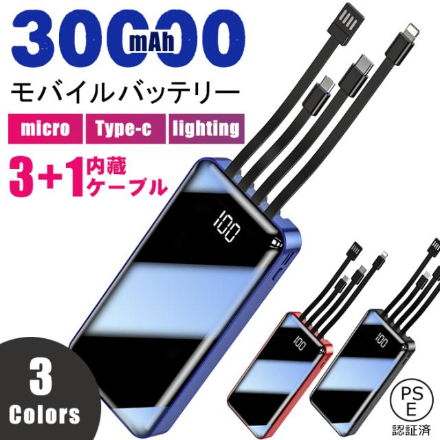 モバイルバッテリー 大容量 30000mAh 携帯充電器 急速充電 LEDライト付 スマホ 防災モバイルバッテリー 旅行用品 PSE認証済 【翌日発送】