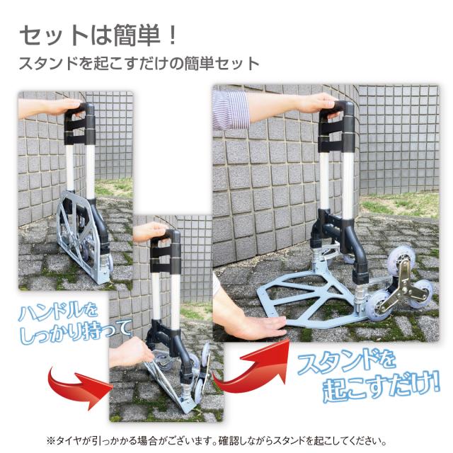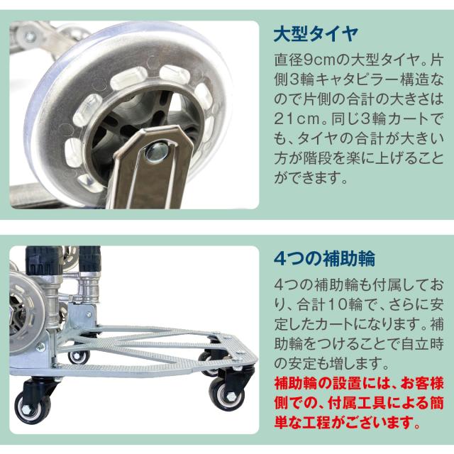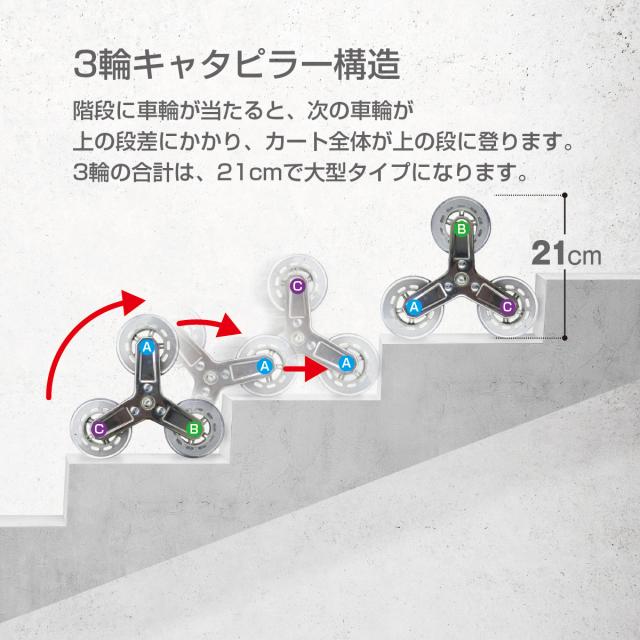 階段に車輪が当たると、次の車輪が上の階段にかかり、カート全体が上の段に登ります。21cmで大型タイプになります。