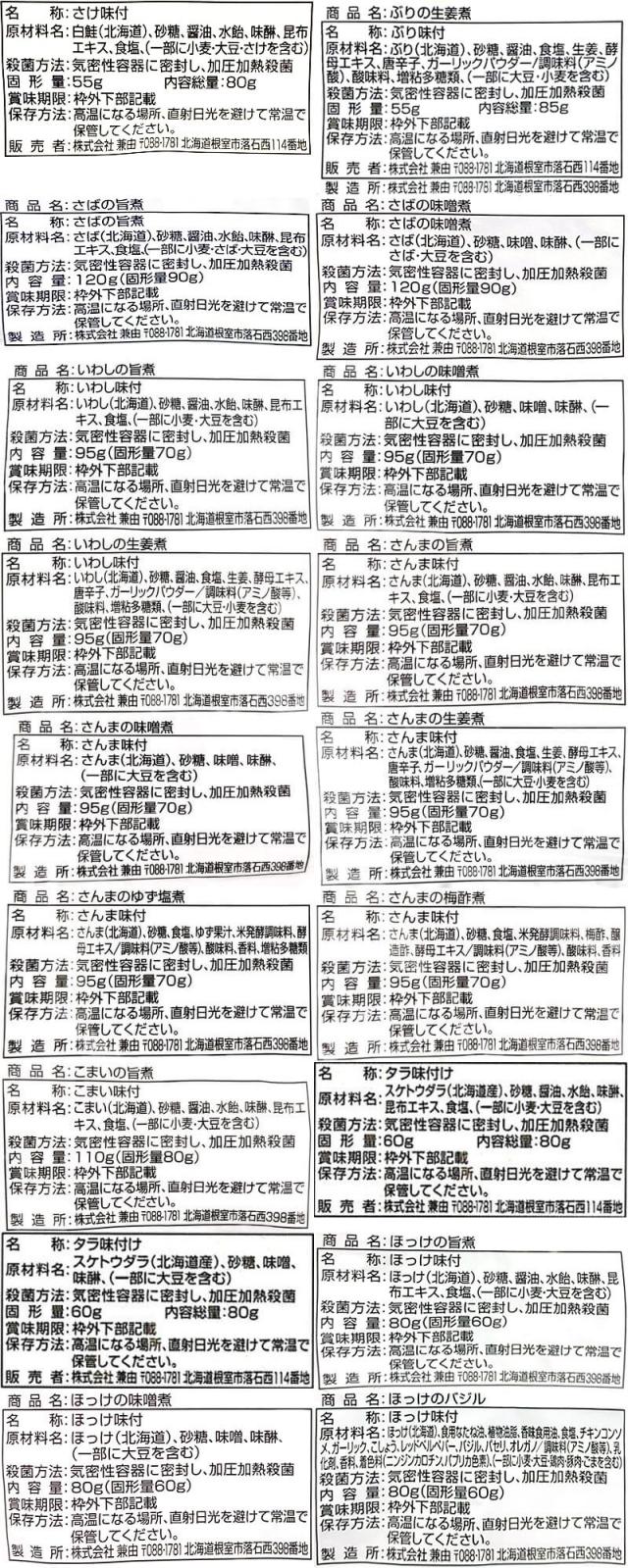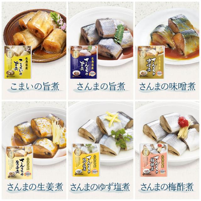 さけ 旨煮 80g ぶり 生姜煮 85g さば 旨煮 120g さば 味噌煮 120g いわし 旨煮 95g いわし 味噌煮 95g いわし 生姜煮 95g さんま 旨煮 95g さんま 味噌煮 95g さんま 生姜煮 95g さんま ゆず塩煮 95g さんま 梅酢煮 95g こまい 旨煮 110g タラ 旨煮 80g タラ 味噌煮 80g ほっけ 旨煮 80g ほっけ 味噌煮 80g ほっけ バジル 80g 18種 18食 |