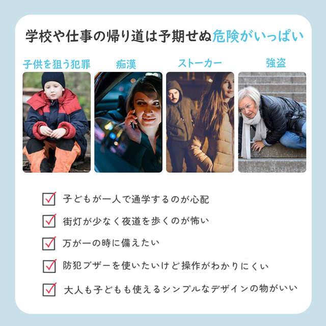 【安全安心な防犯ブザー】いざという時に、引っ張るだけでブザーを鳴らし、周囲に危険を知らせます。シンプルなデザインで、小学生、中学生、子供はもちろん、大人、女性、高齢者でも違和感なく持てる防犯グッズです。