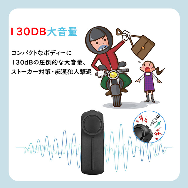 【130dB大音量防犯アラーム】防犯ブザーは大きな音で相手を驚かせて逃げる機会を得るアイテムですので、大きな声がポイントです。この防犯アラームは遠くの人にも気づいてもらえる130dB大音量(測定距離1m)を出せますので、いざという時の安心も高まります。