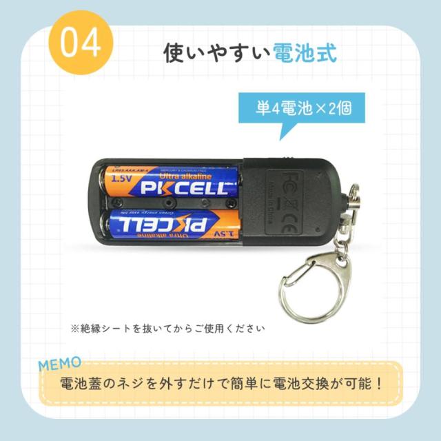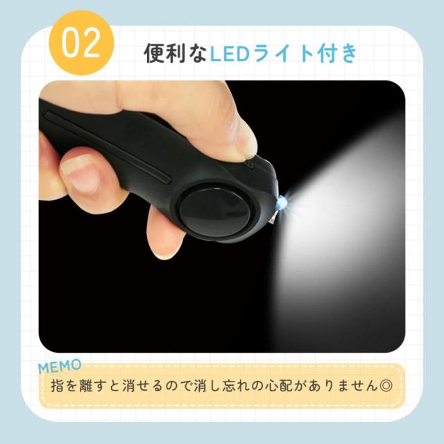 【LEDライト付き&操作簡単】横のボタンを押すと、ライトを点灯、放せると消灯します。LEDライトは防犯効果だけでなく、懐中電灯のようにちょっとしたものを照らすのに使用することができるので便利です。引抜ピンを抜くと、アラームが鳴り響きます。ピンを戻すとブザー音が止まります。使い方はとても簡単です。