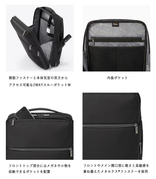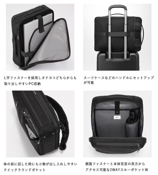 機能一覧:2気室/B4ファイル収納/PC収納(15.6inch)/セットアップ可/2WAYスルーポケット/スリムデザイン/耐水