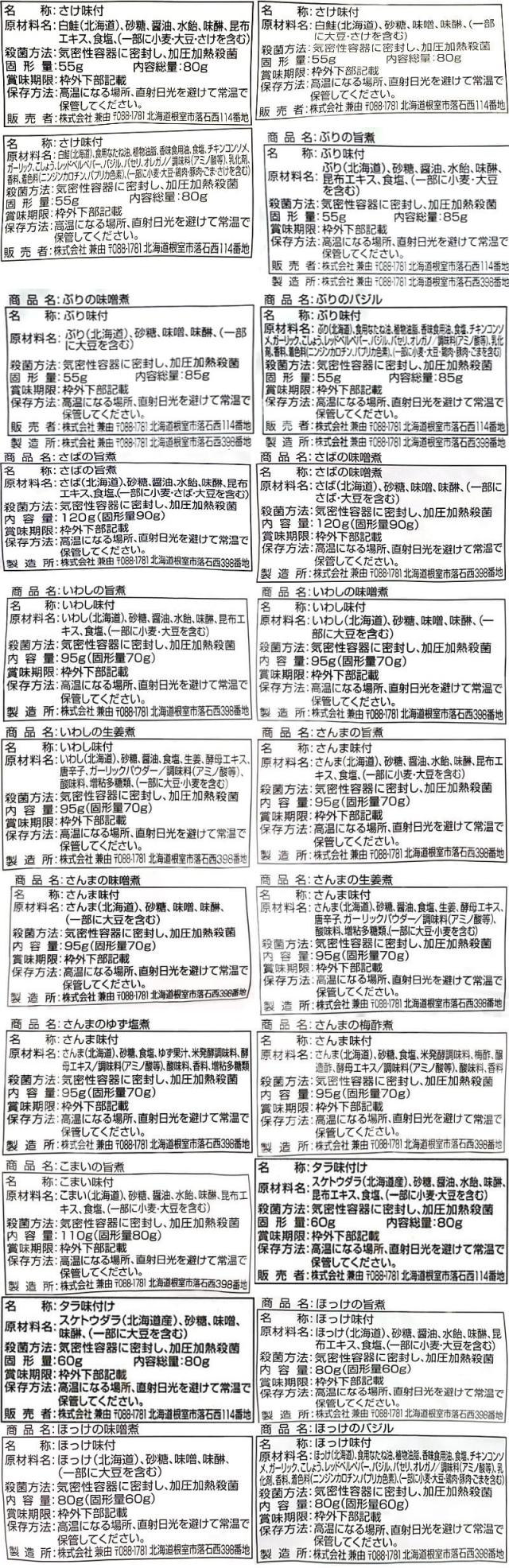 ■ バラエティ 14種14食セット さけ 旨煮 80g ぶり バジル 85g さば 旨煮 120g さば 味噌煮 120g いわし 旨煮 95g いわし 味噌煮 95g いわし 生姜煮 95g さんま 生姜煮 95g さんま ゆず塩煮 95g さんま 梅酢煮 95g こまい 旨煮 110g タラ 旨煮 80g ほっけ 旨煮 80g ほっけ バジル 80g ■ 食卓 14種14食セット さけ 味噌煮 80g ぶり 味噌煮 85g さば 旨煮 120g さば 味噌煮 120g いわし 旨煮 95g いわし 味噌煮 95g いわし 生姜煮 95g さんま 旨煮 95g さんま 味噌煮 95g さんま 生姜煮 95g こまい 旨煮 110g タラ 味噌煮 80g ほっけ 旨煮 80g ほっけ 味噌煮 80g ■ おつまみ 14種14食セット さけ バジル 80g ぶり 旨煮 85g さば 旨煮 120g さば 味噌煮 120g いわし 旨煮 95g いわし 味噌煮 95g いわし 生姜煮 95g さんま 生姜煮 95g さんま ゆず塩煮 95g さんま 梅酢煮 95g タラ 旨煮 80g ほっけ 旨煮 80g ほっけ 味噌煮 80g ほっけ バジル 80g 3種類のセットからお選びいただけます。 |